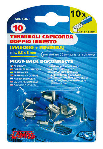 10 terminali - capicorda doppio innesto maschio+femmina - Blu Misura 6,3x0,8 mm.