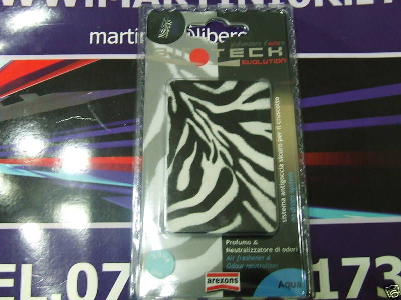 Oggetto | Applicazione: auto. Profumatore da bocchetta. Doppia camera: profumatore e neutralizzatore di odori. Design high tech. Tecnologia a membrana osmotica bicamera. versione: Profumazione Aqua Design Zebrato Confezione: astuccio. |